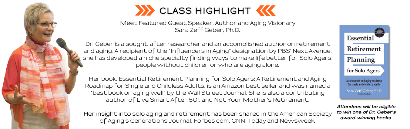 - 10 am: Retirement Essentials for Solo Agers – Dr. Sara Geber – The featured keynote will share expertise on how individuals without traditional family support can approach retirement planning with confidence and intention. She will discuss planning for the next chapter, building social networks, and creating a life of meaning, purpose and fun.
