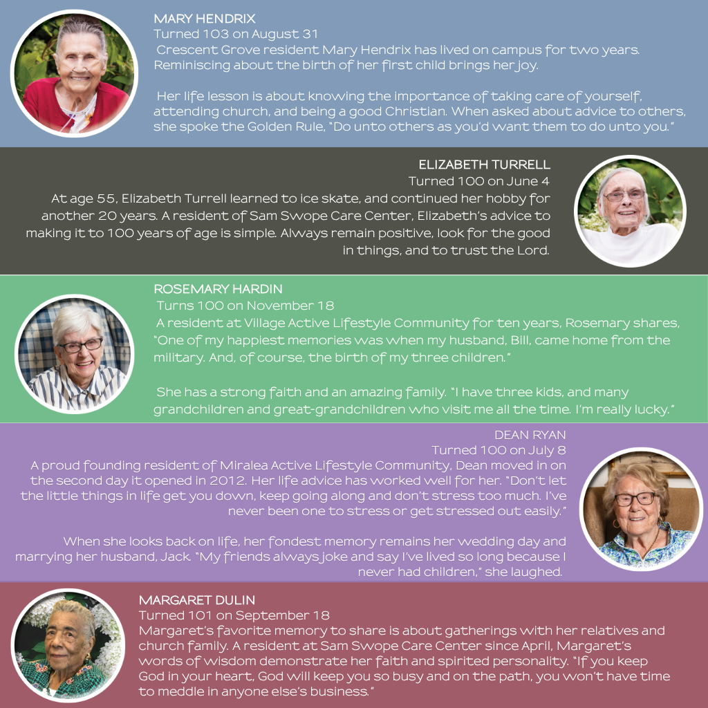 As part of our Louisville Campus’ 100th anniversary, we pay tribute to residents who are 100+ years young. These individuals were invited to write a letter to be included in the time capsule and were honored at the John E. Moyer’s Master Mason Dinner in October. Meet our centenarians.
