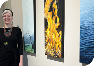 According to Nancy, keeping everyone happy as a curator at Meadow is something Sabra does well. “When Meadow Executive Director Ann Rich and I discussed having my art hang again, it was with the idea that you can keep doing what you love even when your physicality is limited. I used to paint large oils so focusing on smaller paintings required less energy for older hands.” said Nancy.