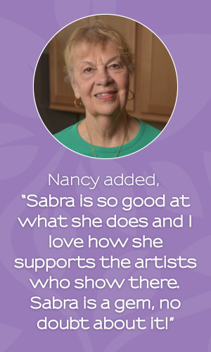 The art rotates out every three months. Her curator responsibilities include meeting the artists and looking at their work to determine what will show best in the gallery. “I think about themes, aesthetic and how the art will flow throughout the space,” Sabra noted.